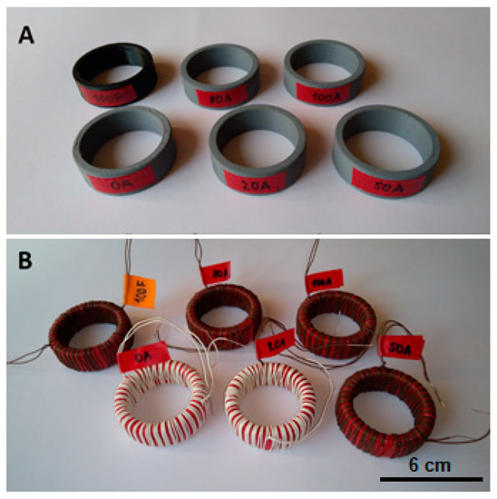 Photographic images of the testing samples for the magnetic properties measurement, (A)—Samples after 3D printing, (B)—Samples with winding configuration.
