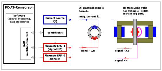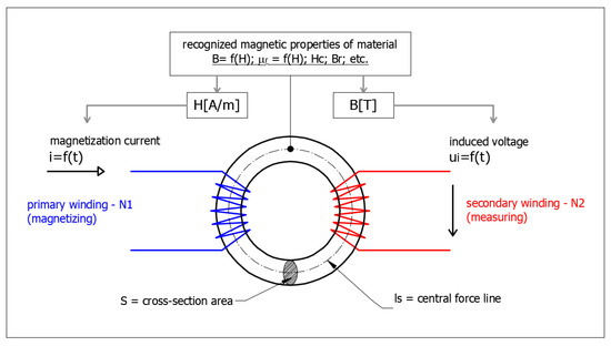 In principle, the magnetizing winding of the measured toroid is connected to a direct current source. The current is very slowly increased and subsequently decreased to create a complete circulation of the entire BH characteristic. The measuring winding is connected to an electronic fluxmeter which records voltage jitters on the measuring winding and integrates this voltage. By a joint evaluation of the excitation current and the integrated voltage, we obtain the resulting BH characteristic—Either only the magnetization or the complete BH hysteresis characteristic [52,53]. An embodiment of the Remagraph measuring system and its basic block diagram is shown in Figure 3. Figure 4 shows the principle of determining the magnetic quantities and the individual connections in the toroidal sample and the measured material.