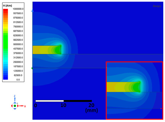 The calculated magnetic field distribution—Magnetic field intensity H (A.m−1). The view in detail is shown in the inset.