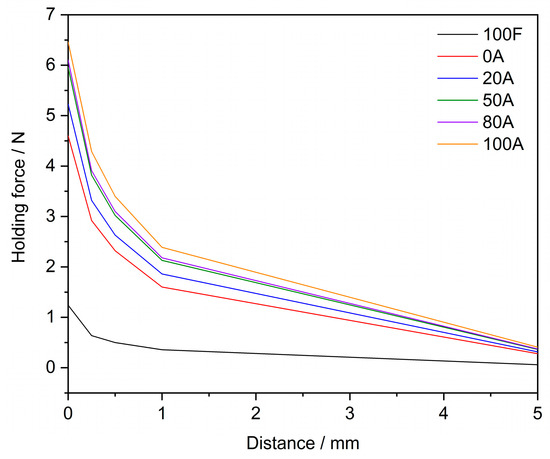 As reported in Figure 12, simulated holding forces calculated for different variants of magnetic filling of the plastic plate were, as expected, found to increase with higher infill density with determined values in the range from 4.5 to 6.5 N at zero distance. Such forces are sufficient to ensure a stable attachment of smaller or lighter objects. Thus, the prepared materials can produce components designed to conduct a magnetic flux or a small force interaction and thus attach a certain object. In practice, such elements can then be used in the construction of magnetic switches or sensors or for the production of components that homogenize the magnetic field of electric motors.