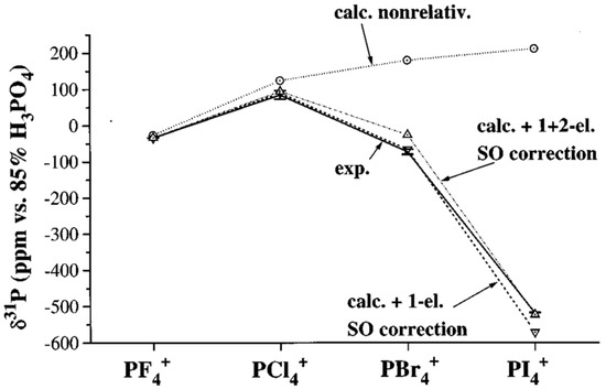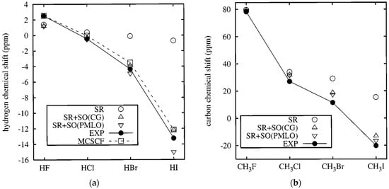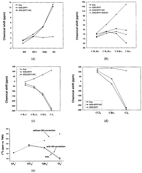 Malkin et al. [97] presented a different method for the calculation of the SO correction (using the one-electron SO operator) to the NMR shielding constants and tested this method on the calculations of the SO corrections to hydrogen chemical shifts of HF, HCI, HBr and HI molecules and carbon chemical shifts of CHnCI4−n, CHnBr4−n, CHnI4−n (for n = 0, 1, 2, 3) series [97] and of halomethyl cations, CX3+ (X = F, Cl, Br, I) [202]. Malkin et al. considered the existing approaches to be seriously spoiled by several disadvantages. To be more precise, from Malkin’s point of view, the third-order Rayleigh–Schrödinger perturbation approach, proposed earlier by Morishima et al. [60], Cheremisin et al. [61], and Fukui et al. [106], required a proper description of singlet–triplet transitions in the framework of a sum-over-states approach, while the second-order perturbation approach, introduced by Pyper [62,63,64,65], Pyykkö [67,68], and Zhang and Webb [66], involved complex arithmetic due to the inclusion of the SO operators. Malkin et al. developed an approach that avoids complex arithmetic and, therefore, is more efficient from a computational point of view. Their approach was based on the sum-over-states density-functional-perturbation-theoretical (SOS-DFPT) method developed earlier for the chemical shift calculations [203,204,205]. The results of SOS-DFPT calculations carried out by Malkin et al. with and without taking into account the SO corrections in comparison with experimental data are presented in Figure 1.