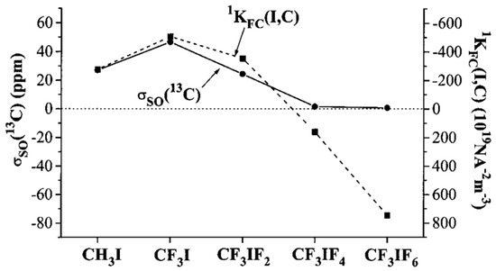 The authors of the work [208] have also plotted the 13C SO-HALA shifts against the FC contributions of the reduced one-bond I-C coupling constants, 1K(I,C), in CH3I and CF3IFn (n = 0, 2, 4, 6) molecules, see Figure 5. It shows that ongoing from CH3I to CF3I the two quantities correlate with each other. However, starting from CF3IF2 molecule, the discrepancy in their behaviors rapidly increase. This was attributed to the removal of the iodine nonbonding orbitals.