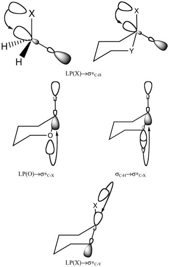 Relevant NBO interactions for methane, cyclohexane, and pyran derivatives, where X = F, Cl, Br, and I, and Y = CH2 and O. Reproduced from Neto et al. [227] with the permission of American Chemical Society.