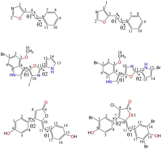 Demissie et al. [231] has reported high-level calculations of 13C chemical shifts of six representative organic compounds (see Figure 10), with and without heavy elements, at both non-relativistic and four-component relativistic Kohn–Sham DFT levels. The performances of different pure GGA exchange-correlation functionals (PBE [232,233], SVWN5 [234,235], BP86 [236,237], PW91 [238]) were compared at both the non-relativistic and relativistic levels of theory. According to Demissie et al., the structural elucidation of naturally occurring organic molecules with heavy atoms, like those containing iodine atoms, with database approaches [239,240] is problematic due to the lack of information of relevant NMR properties of such compounds in such databases. In such cases as these, four-component relativistic calculations are a promising concomitant means of the structure elucidation via the NMR experiment. Demissie et al. showed that pure GGA functionals perform better than the hybrid B3LYP functional, providing high-accuracy results within the advanced relativistic four-component DFT theory applied in combination with the restricted magnetic balance condition and gauge-including atomic orbitals approach (GIAO-mDKS-RMB). The four-component calculations were found to be highly efficient, but not significantly more expensive than the corresponding non-relativistic calculations. Of all the GGA functionals considered by Demissie et al., the PBE functional demonstrated the best performance, though, the results obtained with the BP86 functional appeared to be very close to those obtained with the PBE functional. For the iodine compounds (see Figure 10), the relativistic effect on the NMR chemical shift of carbon directly bonded to the iodine atom (α-HALA effect) appeared to be substantial, about −38 ppm, while the relativistic correction to the same chemical shift in a parent compound in which there is no iodine substituent was found to be only −2 ppm. The bromine atom induces the α-HALA shielding (negative) contributions to the carbon chemical shifts of about 10–12 ppm, depending on the attached subunit.