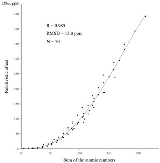 Taking into account that in most cases the relativistic effects on the NMR shielding constants of light nucleus in reference compounds, , are small (take, for example, the relativistic correction of only −0.02 ppm to proton-shielding constant in TMS [187]), one can roughly attribute the facts established for the negative , including , to .