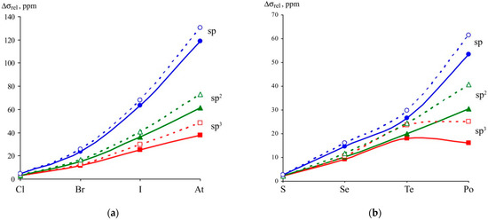 The SR effects give only minor contributions to the proton and carbon-shielding constants, while the SO effects are responsible for the most part of the relativistic contributions for heavier substituents, agreeably providing the correct behavior of the shielding constants with an increasing atomic number of halogen substituents, see Figure 7.