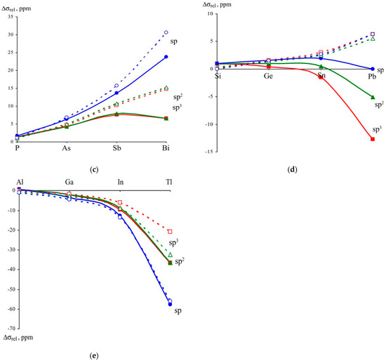 As was suggested by Kaupp et al., the conclusion (i) unfolds into several important issues: (i-i) the one-bond spin–orbit SO-HALA shifts increases from sp3 to sp2 to sp hybridized carbon; (i-ii) the 1H shifts are the most sensitive ones to the spin–orbit effects from neighboring heavy atoms as the hydrogen 1s-orbital predominates in bonding; (i-iii) in the case of p-block main-group central atoms considered as the light NMR spectator atoms, the valence s-orbitals are fully involved in bonding when these atoms are in their highest oxidation states, therefore, one should expect large shielding spin–orbit effects for them.
