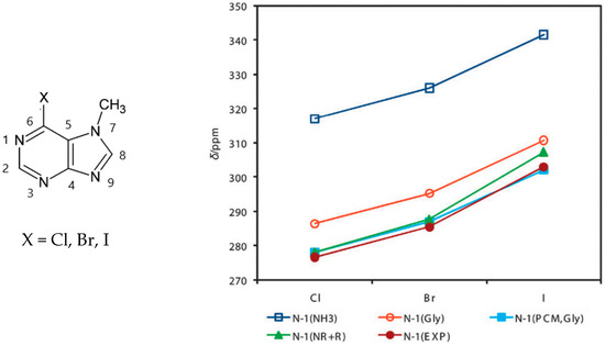 - Standara, S.; Maliňáková, K.; Marek, R.; Marek, J.; Hocek, M.; Vaara, J.; Straka, M. Understanding the NMR chemical shifts for 6-halopurines: Role of structure, solvent and relativistic effects. Phys. Chem. Chem. Phys. 2010, 12, 5126–5139. [Google Scholar] [CrossRef] [PubMed]