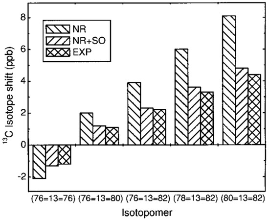 - Lantto, P.; Vaara, J.; Kantola, A.M.; Telkki, V.-V.; Schimmelpfennig, B.; Ruud, K.; Jokisaari, J. Relativistic Spin-Orbit Coupling Effects on Secondary Isotope Shifts of 13C Nuclear Shielding in CX2 (X = O, S, Se, Te). J. Am. Chem. Soc. 2002, 124, 2762–2771. [Google Scholar] [CrossRef] [PubMed]