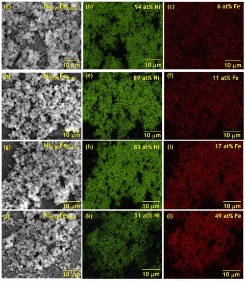 Elemental mapping of Ni and Fe determined by energy dispersive x-ray spectroscopy of (a–c) Ni0.95Fe0.05, (d–f) Ni0.90Fe0.10, (g–i) Ni0.80Fe0.20, and (j–l) Ni0.50Fe0.50.