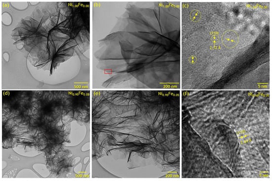 We used bright-field transmission electron microscopy (BF-TEM) to probe the structure of unsubstituted α-Ni(OH)2 (Ni1.00Fe0.00) and the 5% Fe-substituted (Ni0.95Fe0.05) materials (Figure 4). The lattice fringes of Ni1.00Fe0.00 (Figure 4c) obtained from the planar edge region of the nanosheet (relative to the electron beam; boxed in red in Figure 4b) show that an individual nanosheet is comprised of multiple nanocrystals (or crystallites) with lattice spacings of 2.69–2.72 Å, consistent with d-spacing of (110) planes of α-Ni(OH)2 (2.68 Å) from XRD analysis (Table 1). The nanosheets observed within the BF-TEM images have different darkness levels, which are influenced by the nanosheet thickness and aggregation. Unsubstituted α-Ni(OH)2 nanosheets synthesized using a similar prep comprise two to three individual Ni(OH)2 octahedra layers with an average thickness of 1.52 nm [45], while Al-substituted Ni(OH)2 nanosheets comprise stacks of 6–40 individual layers [11]. TEM images (Figure 4) show that the Ni1.00Fe0.00 and Ni0.95Fe0.05 are composed of nanosheets with large lateral dimensions which is consistent with XRD analysis that indicates the nanosheets organize and increase in length along the (110) plane relative to the (001) plane. For unsubstituted α-Ni(OH)2 (Ni01.0Fe0.00), the lateral size of the crystallites, Din-plane, (14.3 nm) determined from XRD analysis is 2–3 orders of magnitude smaller than the lateral dimensions of the nanosheets (~1000 nm) observed by electron microscopy; the nanosheets consist of multiple crystallites oriented without a preferred orientation within the nanosheet plate rather than a nanosheet being a single crystal. From the TEM images, as Fe is substituted for Ni, layers become more closely spaced and create more “ridges”. The topography of the 0% Fe sample shown on Figure 4c is a lot flatter than the topography of the 5% Fe sample shown in Figure 4f. These surface features can create local crystal anisotropy and can potentially increase the magnetic energy barriers for spins.
