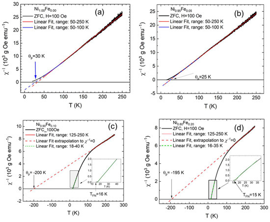The inverse susceptibility () plots for all samples calculated from the ZFC magnetization in 100 Oe are shown in Figure 5c. We analyze the inverse susceptibility for a magnetic field of 100 Oe to ensure that there are no artifacts due to magnetic flux trapped in the superconducting magnet or contributions from the capsule above 100 K where the sample magnetization is lower. The ZFC magnetization with the 100 Oe applied field can be considered as the net spontaneous magnetization. It is clear that there are two different kinds of temperature dependence. At high temperatures increases linearly with temperature for all samples but is much larger for the 0% and 5% Fe samples (Figure 5c). Below 50 K, we need to examine the behavior for each sample separately. The magnetic susceptibility of paramagnetic materials follows the Curie–Weiss law above a critical temperature Tc. C is the Curie constant and extrapolation of vs. T to a straight line cuts the temperature axis at , the paramagnetic Curie point; for ferromagnets and for antiferromagnets or ferrimagnets. Below , there is a long-range spin order even in the absence of an applied field so a spontaneous magnetization appears [47].