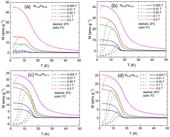 Zero field cooled (ZFC) and field cooled (FC) susceptibilities for applied fields of 50 Oe, 100 Oe, 200 Oe, 500 Oe, 0.1 T, and 0.5 T. field for (a) Ni1.00Fe0.00 (0% Fe), (b) Ni0.95Fe0.05 (5% Fe), (c) Ni0.90Fe0.10 (10% Fe), and (d) Ni0.80Fe0.20 (20% Fe).