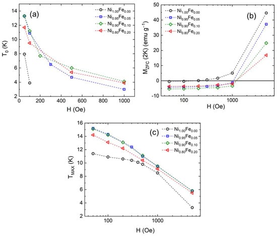 (a) Compensation point, T0, as a function of the applied magnetic field, and (b) ZFC magnetization at 2 K versus applied magnetic field, and (c) temperature at which the ZFC magnetization has a maximum TMAX, versus applied magnetic field, for Ni1.00Fe0.00 (0% Fe), Ni0.95Fe0.05 (5% Fe), Ni0.90Fe0.10 (10% Fe), and Ni0.80Fe0.20 (20% Fe).