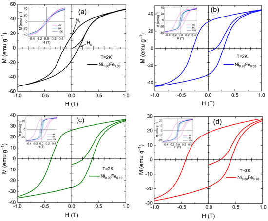 M vs. H loops at 2 K for (a) Ni1.00Fe0.00 (0% Fe), (b) Ni0.95Fe0.05 (5% Fe), (c) Ni0.90Fe0.10 (10% Fe), and (d) Ni0.80Fe0.20 (20% Fe) The remanence (Mr) and coercivity (Hc) are labeled in (a); insets in (a–d) show M vs. H loops for 4, 8 and 10 K.