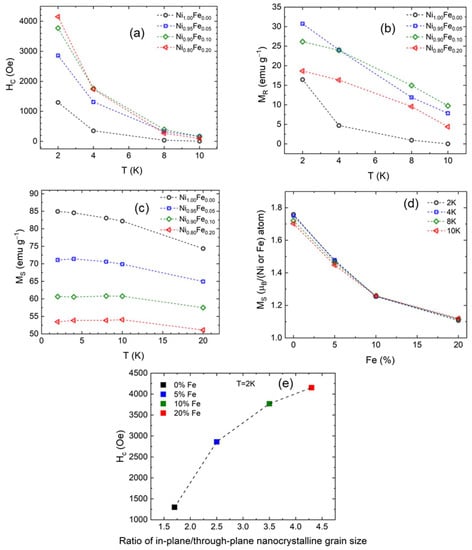 (a) Coercive field (HC), (b) remnant magnetization (MR), and (c) saturation magnetization (MS) as a function of temperature for −20% Fe samples; (d) saturation magnetization (MS) in Bohr magnetons as a function of Fe % at low temperatures; and (e) plot of coercive field (HC) versus ratio of in-plane/through plane nanocrystalline grain size for 0–20% Fe samples.