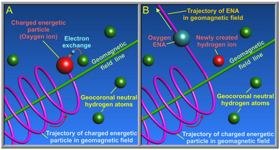 The charge-exchange reaction is a collisional process between an ion and a neutral atom or molecule, wherein one or more electrons are transferred from the neutral atom to the ion. In space, owing to acceleration by electromagnetic fields, ions are naturally more energetic than neutrals [7]. Hence, the charge-exchange process usually ends with a fast ENA and low-energy ion. Radiation, most likely X-rays, may also be produced when the transferred excited electrons return to the ground energy state during the reaction [44,48]. This process imposes non-negligible effects on the physics of the planetary atmosphere, galaxy, or cosmos. It also provides two valuable methods, ENA and X-ray remote sensing, to survey space or the cosmos. Figure 2 shows an example of charge exchange reaction between energetic oxygen ions and geocoronal hydrogen neutral atoms.