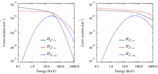 Cross section between ions (left: H+, right: O+) and geocoronal atoms.