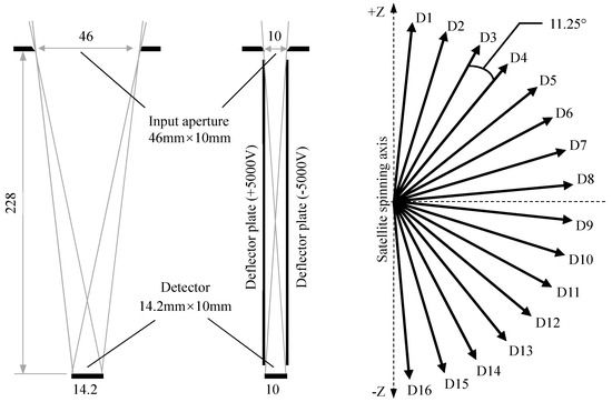 The NUADU is equipped with 16 solid-state detectors (SSD), evenly distributed within a 180° elevation range. Each SSD has a field of view of 11.5° × 2.5° (for elevation and azimuth, respectively). The instrument scans in the azimuthal direction while the TC-2 satellite spins. During a full satellite spinning cycle of 4 s, the instrument performs 128 samplings with an integral time of 31.25 ms. Consequently, for each 4 s interval, the ENA counts can be binned into a matrix with 2048 grids (16 × 128). The ENA counts from multiple spin cycles may be further summed up by the onboard data processing unit to produce a final telemetry data frame. The instrument is usually configured to sum each 4-spin sample, which accounts for an integrated time of 125 ms. Deployment of the sixteen along satellite spinning axis is illustrated in Figure 4.
