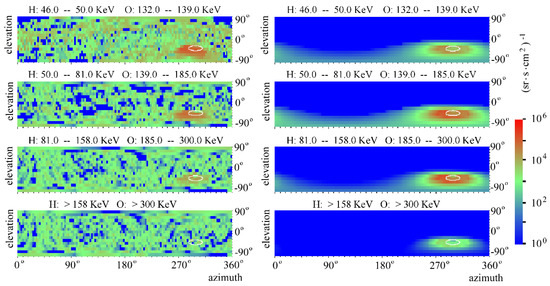 Using the model described by Shen and Liu [44] and the same parameter set it took, Chen et al. [54,55] simulated real TC-2 satellite positions and compared the results with the ENA images captured by NUADU. There were significant discrepancies between the observations and simulations, particularly with regard to the local time distribution, latitudinal distribution, and energy spectrum. Comparisons between observed and simulated ENA images are shown in Figure 6. Keeping these discrepancies in mind, the author made some amendments to the model and got more consistent results. Major amendments include changing the Kappa energy spectrum to a Maxwellian one, replacing the fixed O+/H+ ratio with a varying ratio determined by the geomagnetic Kp index in according with the fact that the ratio of O+ may dramatically increase during magnetic storms [46], skewing ion injection front from the nightside to the dusk side of the Earth, adding oxygen and helium species to the neutral exosphere mode that made low altitude regions much more important in ENA production, and adding ENA stripping (re-ionizing) process to the mode assuming an optical-thick scenario. The updated mode and results were presented in his Ph.D. thesis [56].