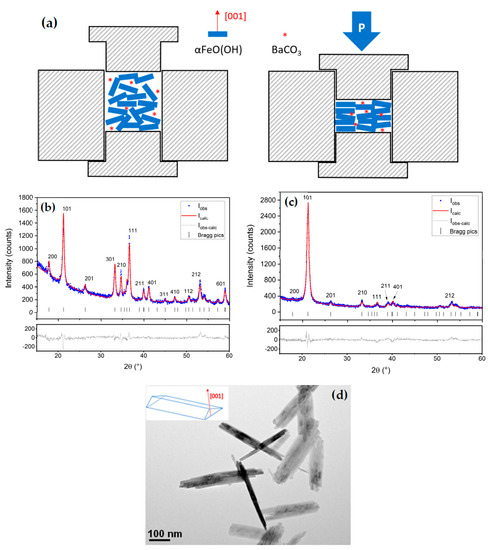 (a) Schematic representation of the alignment in the basal plane of goethite crystallites, observed after uniaxial pressure. (b,c) Rietveld analysis of goethite before and after pressing process, respectively. (d) TEM images of lath-shaped goethite crystallites.