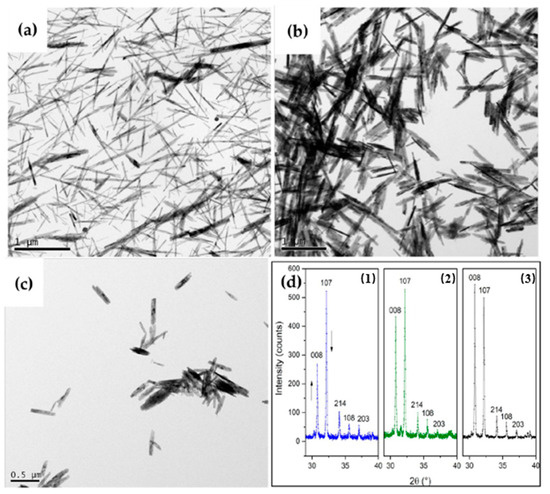 (a–c) Goethites G1, G2, G3, respectively. (d) X-Ray pattern of oriented BaM samples (1–3) obtained with G1, G2, G3, respectively.