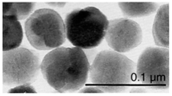 The effect of the applied pressure was different on hematite particles than on goethite crystallites. This is a key point of the manufacturing process, which we will emphasize. Now we consider the hematite particles, which have a spherical shape (Figure 3): because the applied pressure does not have any effect on the orientation of these particles, their crystallographic axes remain randomly oriented.