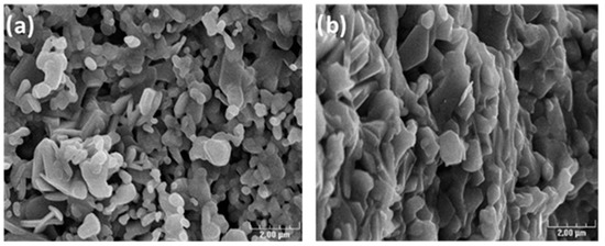 The microstructures of the samples are imaged by a scanning electron microscope Hitachi-S-3200N (Japan). The hysteresis loops of the sintered samples are measured at room temperature using a Vibrating Sample Magnetometer EZ9 from MicroSense (Lowell, MA, USA), with maximum applied field intensity equal to 1500 kA/m. Each sample was maintained on a Pyrex sample holder, with its c-axis (this axis being defined by the direction of the applied pressure during compaction, as explained below) aligned firstly parallel, and then perpendicular, to the applied field, in order to measure the hysteresis loops in both directions. The sample oscillated at a frequency of 70 Hz and averaged for 3 s. The demagnetizing correction is further carried out by applying the relationship Hi = H-NM, where Hi is the internal filed and H the applied field. The values of the demagnetizing factor N are tabulated in [22]. The frequency evolution of the imaginary part of the magnetic permeability is extracted from S parameters measured by a ZVA67 vector network analyzer (Rohde & Schwarz, Munich, Germany) in the frequency band [10 GHz–60 GHz]. The frequency evolution of the imaginary part of the magnetic permeability is extracted in using a Rohde and Schwarz ZVA67 vector network analyzer in the frequency band [10 GHz–60 GHz]. The anisotropy field HK is deduced from the resonant frequency fR determined by the maximum of the imaginary part µ” of the intrinsic permeability of the sample from the relationship between HK and fR, which writes fR = γHK, where γ is the gyromagnetic ratio (γ = 35.12 × 10−3 MHz/A.m−1).