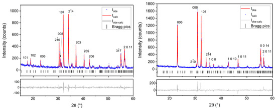 X-ray diffraction data were processed with HighScore Plus software (Panalytical, UK) [27] for phase analysis and Jana2020 for Rietveld analysis. The latter made it possible to examine the purity of the samples and to characterize the stacking of the crystallites. The crystallographic model used comes from the ICSD 259873 CIF file with cell parameters a = b = 5.8909 Å, c = 23.1882 Å and space group symmetry P63/mmc. The Rietveld analysis shows that all samples are single-phase (Figure 5). After refinement, the cell parameters and R factors for BaM-0 are a = b = 5.8928 Å, c = 23.2295 Å and Robs = 3.67, wRobs = 4.47, Rall = 4.78, wRall = 4.68, GOF = 1.19, whereas and BaM-100, they are a = b = 5.8921 Å, c = 23.2161 Å and Robs = 5.41, wRobs = 5.60, Rall = 6.42, wRall = 5.79, GOF = 1.26.