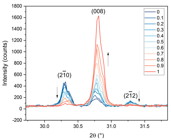 When comparing the X-Ray diffraction pattern of all the samples from BaM-0 to BaM-100, it appears that (00l) basal reflections become stronger (Figure 5). This is explained by an increasing orientation of the crystallites [28]. More specifically the (008) reflection becomes stronger with the increasing goethite to hematite molar ratio, meaning that the rate of oriented BaM particles increases as well (Figure 6).