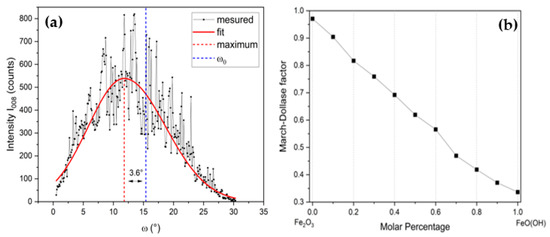 (a) Rocking curve for the intensity of the (008) Bragg diffraction pic. (b) Evolution of the March–Dollase factor as a function of mole percentage of goethite.