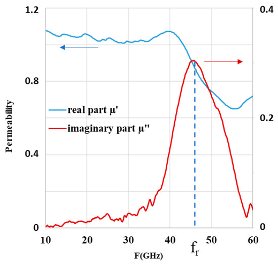 The broadband complex permeability of the BAM-0 sample was measured in the frequency band [10 GHz–60 GHz] by the transmission/reflection method using a Rohde and Schwarz ZVA67 vector network analyzer. The demagnetized sample was placed on the top of a high-frequency microstrip line to measure the transmission S21 and reflection S11 parameters. First, the effective permeability of the structure (microstrip line and sample) was calculated from the measured S-parameters using a specially written Matlab code based on the NRW equations [36]. Then, conformal mapping applied to permeability [37,38] was used to extract the intrinsic permeability of the sample from the effective multilayers structure. Finally, the anisotropy field HK of the hexaferrite was deduced from the resonant frequency determined by the maximum of the imaginary part µ” of the intrinsic permeability. The frequency evolution of µ’’(f) normalized to its maximum is shown in Figure 9. The maximum of µ’’(f) occurs for fR = 46.6 GHz, to which corresponds HK = 1330 kA/m (i.e., 16.6 kOe). This result agrees with the value of the anisotropy field HK of BaM ferrites, which is close to 1360 kA/m (i.e., 17 kOe). However, a distribution of switching fields inevitably appears in a given assembly of particles with shapes, sizes, morphological, and structural defects that vary from one particle to another, and then the anisotropy field thus determined should correspond to the higher value of the anisotropy field distribution f(HK).