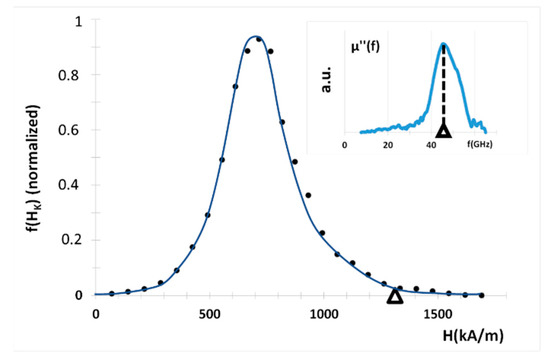 The anisotropy field value obtained from microstrip experiments, , is very close to the one for which f(HK) cancels. While the IRM measurements give the anisotropy field distribution, the microstrip line measurement method provides the maximum value of anisotropy field, which corresponds to the field to be applied to complete the coherent spin rotation in the Stoner and Wolfarth model [40].