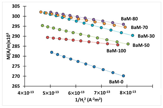 Law of approach to saturation of some BaM samples. The determination coefficients R2 in M vs. 1/Hi2 linear relations are better than 0.999 in any case.
