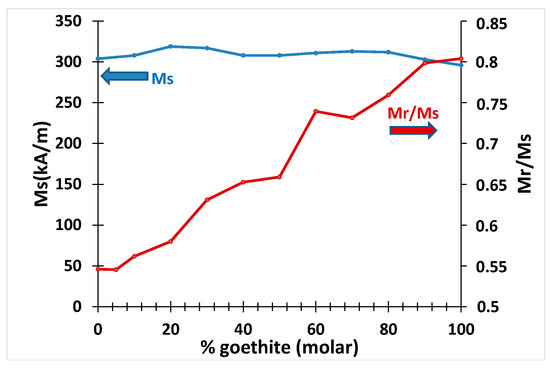 Variations of the saturation magnetization (MS) and reduced-remanence magnetization (MR///MS) with the molar percentage of goethite.