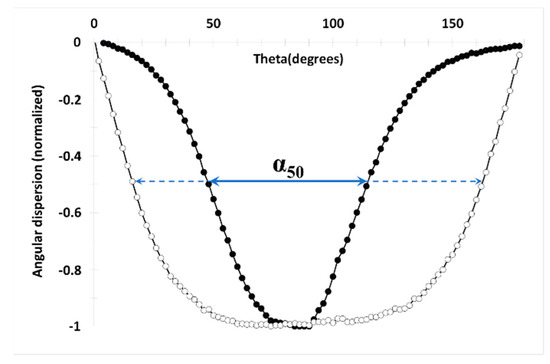 Measured angular dispersion and full width at half-remanence α50 for BaM-0 (open circles) and BaM-100 (full circles).