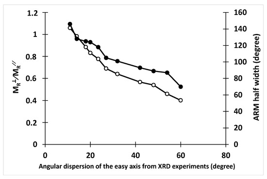 In [44], the angle between the cubic axis that forms the smallest angle with the direction of the applied field is chosen as to represent the grain-dispersion parameter τ (Equation (10)). There is a strong correlation between the angular dispersion of the axes of easy magnetization and both the ratio MR⊥⁄MR∕∕ on one hand, and with the width at half height α50 of the ARM, on the other hand (Figure 15).