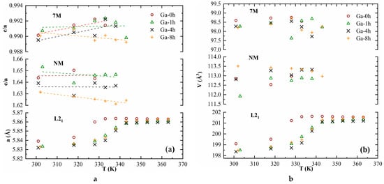 The lattice parameters at RT of all samples are given in Table 1. Their evolution with temperature is summarized in Figure 2, together with that of unit cell volume. It can be immediately observed that the thermal treatments produced an increase in the temperature at which the three phases coexist, from approximately 330 K in the Ga-0h sample to around 343 K in the Ga-8h sample.