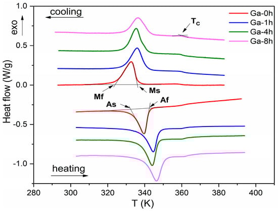 DSC scans on the cooling and heating cycles for as-prepared (Ga-0h) and thermally treated samples (Ga-1h, Ga-4h, and Ga-8h, respectively).