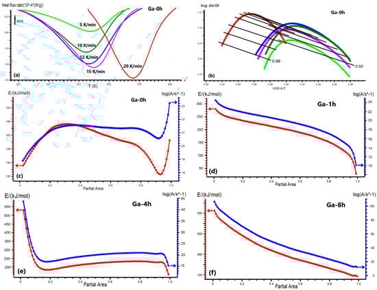 DSC curves at the different heating rates (5, 10, 12, 15, 20 K/min) for the Ga-0h sample (a); the 1/T dependence of logdα/dt according to the Friedman model for the Ga-0h sample (b); the dependencies of the activation energy and pre-exponential factor by the transformed fraction (α) according to the Friedman model for the Ga-0h (c), Ga-1h (d), Ga-4h (e), and Ga-8h (f) samples, respectively.
