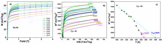 A calculation of the Curie temperature (Tc) from the first derivative of magnetization, with respect to the temperature, is used frequently, but it is somehow insubstantial [] and enables an estimation for the austenite phase only. Alternately, the Arrott plot method [], based on the Ginsburg–Landau mean field frame/theory for magnetism, allows us to evaluate the Curie temperature for both the austenitic and martensitic phases. Therefore, the magnetization isotherms were measured up to a maximum of 4 T at different temperatures along the martensitic transformation (300–351 K), with a temperature variation of ~5 K. Figure 6a presents these measurements for the Ga-4h ribbons. The Arrott representation for the Ga-4h sample obtained from the magnetization isotherms is shown in Figure 6b.