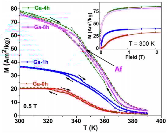 The inset of Figure 7, which shows the magnetization curves recorded at 300 K, highlights the increase in the saturation magnetization of martensite as the annealing time increases. This increase in magnetization (by 2.4 times for sample Ga-4h) is accompanied by an increase in Tc and the magnetization difference between austenite and martensite observed during MT (from the temperature dependence of magnetization measured in 0.5 T applied magnetic field) as a result of a larger magnetocrystalline anisotropy of the martensitic phase []. According to thermal analysis and XRD results, a thermal treatment time of 4h is not enough to produce noticeable structural changes (the Ga-4h and Ga-1h parameters’ behavior is similar). Bearing in mind that the γ phase (which also contributes to the high magnetization of the Ga-4h and Ga-8h samples) is present in a small amount and undetectable by XRD, another mechanism could explain the significant increase in magnetization after long-term treatments. A very recent study [] quantitatively discusses vacancy-mediated diffusion as the main atomic mechanism responsible for the ordering process and changes in Ni-Mn-Ga Heusler alloy properties (Ms, TC, or MT). The same authors, by comparing the calculated positron lifetime values associated with Ni vacancies [] and the experimental values obtained from quenched Ni-Mn-Ga alloys [,], conclude that the ordering process is assisted by Ni vacancies, with the migration energy of Ni vacancies being one of the key parameters which govern the atomic ordering process in Ni-Mn-Ga alloys.