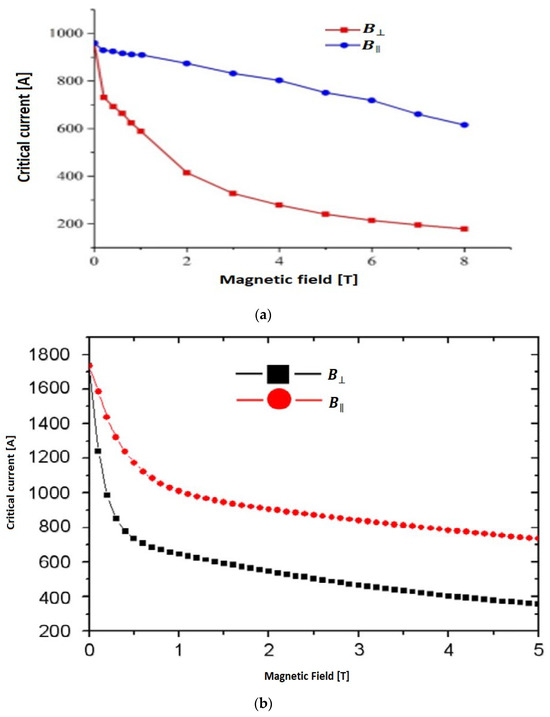 (a) Critical current as a function of magnetic field for YBCO at 20 K [28]; (b) Critical current as a function of magnetic field for BSCCO at 20 K [29].