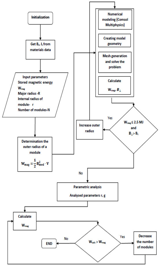 Figure 5 shows the algorithm for determining the parameters of the modular torus and a numerical way to verify it. The initialization of the problem consists of choosing the type of superconducting material used to make the toroidal coil. Using the curves of critical current (Ic) as a function of magnetic field (B) at different temperatures Ic(B) for YBCO and BSCCO, the values for the maximum magnetic field and the supply current are obtained. These values must be chosen below the critical values of the respective material. In the present case, the maximum value of the 2T magnetic field is imposed for both materials, and the current values for YBCO is I = 400 A for BSCCO is 500 A. The next step consists of introducing the initial data into the problem (stored energy, radius of the modular coil, number of modules and the height of a module). With these data, and using the relationship for the magnetic energy (the imposed value of the stored magnetic energy Wmag = 2.5 MJ), the value of the external radius of the toroidal coil module (Rout) is obtained. This is composed of the inner radius r and the thickness of the module g (Rout = r + g). Using the previous geometrical and electrical data, a numerical verification of the stored magnetic energy and of the perpendicular magnetic field is performed. The numerical verification means a Comsol simulation. If these numerical values, verify the condition (Wmag ≤ 2.5 MJ and B_⊥ < Bc) then the next step is followed. It consists of a parametric analysis to choose the best possible performance of the coil. Otherwise, the external radius r of the coil module is increased. Regarding the parametric analysis, it is based on two parameters: r and g. Their variation is carried out over a range of 0–40 mm for g and 0–70 for r. These combinations of the two parameters are chosen so that the volume of the superconducting material remains constant and the stored magnetic energy is calculated for these values. If a lower energy value is obtained than the one imposed, the algorithm ends. Otherwise, the number of modules is reduced by one unit and the stored energy is calculated again until a value closed to the required one is reached. In this case, the algorithm provides the geometric data of the coil with the best efficiency.