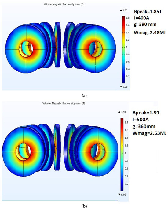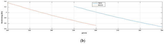 The simulations were performed considering both YBCO and BSCCO materials being in a superconducting state at temperatures of 20 K. For the initial parameters of the YBCO material r = 200 mm g = 390, we obtain a value of the stored magnetic energy of 2.48 MJ. Following the parametric analysis, in which the superconductor volume is kept constant for the r = 265.14 mm g = 350 mm configuration, a value of the stored energy of 3.23 MJ is obtained and, therefore, the stored energy increased with = 0.75 MJ.