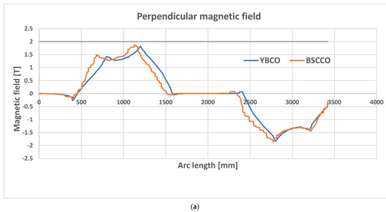 The maximum magnetic flux density is at the center of the inner part of the magnet, as expected, and its value is lower than the constraint value, and, . It can also be observed that in the case of the BSCCO material, the thickness of the coil module is 30 mm smaller than the YBCO module, the amount of stored energy being approximately the same. The reduction of this size is due to the fact that the BSCCO material can be supplied with a current greater with 100 A compared to the YBCO material. Figure 7a shows the graph of the magnetic field perpendicular to the toroidal coil (the component that affect significantly the superconducting state). It can be seen that the maximum value is lower than the imposed magnetic field. Figure 7b shows the parallel component of the magnetic field. This has much lower values than the perpendicular component. In Table 3, the length of the conductor is calculated and it is related with the energy stored according to each material. For YBCO, 16 modules toroidal coils were obtained at 2.26 Km of the conductor/module, and for BSSCO, 16 modules toroidal coils were obtained at 1.75 Km of the conductor/module. Analyzing the literature [39,40] we may consider that these lengths are achievable in practice.