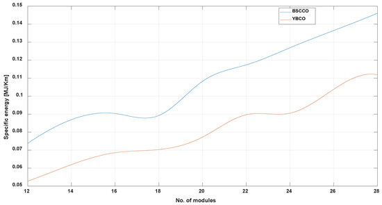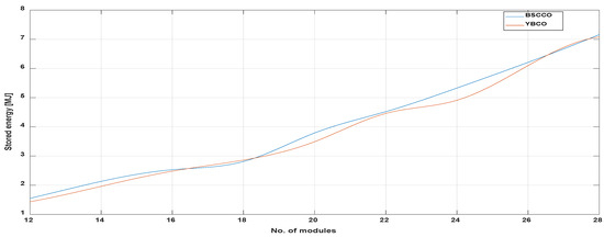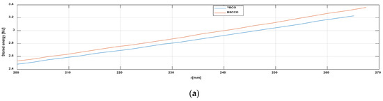 From Figure 8a,b it can be seen that the stored magnetic energy increases when the internal radius of the module increases and its thickness decreases. In other words, a thin module stores a larger amount of energy. The maximum energy value is 3.23 MJ for YBCO and 3.36 MJ for BSCCO. In order to obtain the value of 2.5 MJ proposed initially, the number of modules should be reduced, maintaining the new values for the internal radius and the thickness of the module.