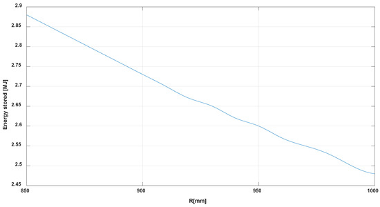 Another parameter that is involved in the toroid design is the major radius R of the torus. In order to study the influence of R on the stored energy, we considered 16 modules and performed a parametric analysis with a step of 10 mm, the range of variation being from 1000 mm to 800 mm (the smallest possible). The graph from Figure 11 shows this variation. A 13% higher value was obtained for the stored energy for the most compact torus, which is in good agreement with results from the literature [14].
