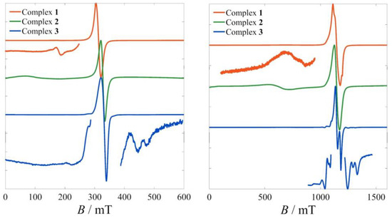 Room-temperature powder spectra of 1–3 at the X-band (left) and at the Q-band (right). Only complex 3 shows a partially resolved fine and hyperfine structure.
