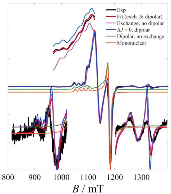 To validate the model used and to justify the number of terms employed, the effect of each of these terms was demonstrated by simulations shown in Figure 6. The most salient observation is the remarkable effect of the exchange terms on the spectral appearance, both in the central and on the lateral absorptions. Simulations considering only the dipolar contributions or a simple mononuclear paramagnetic species were far from the observed spectrum.